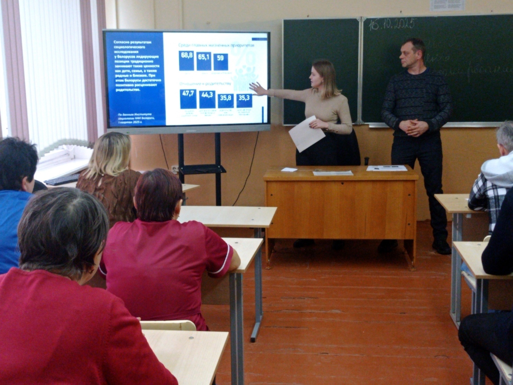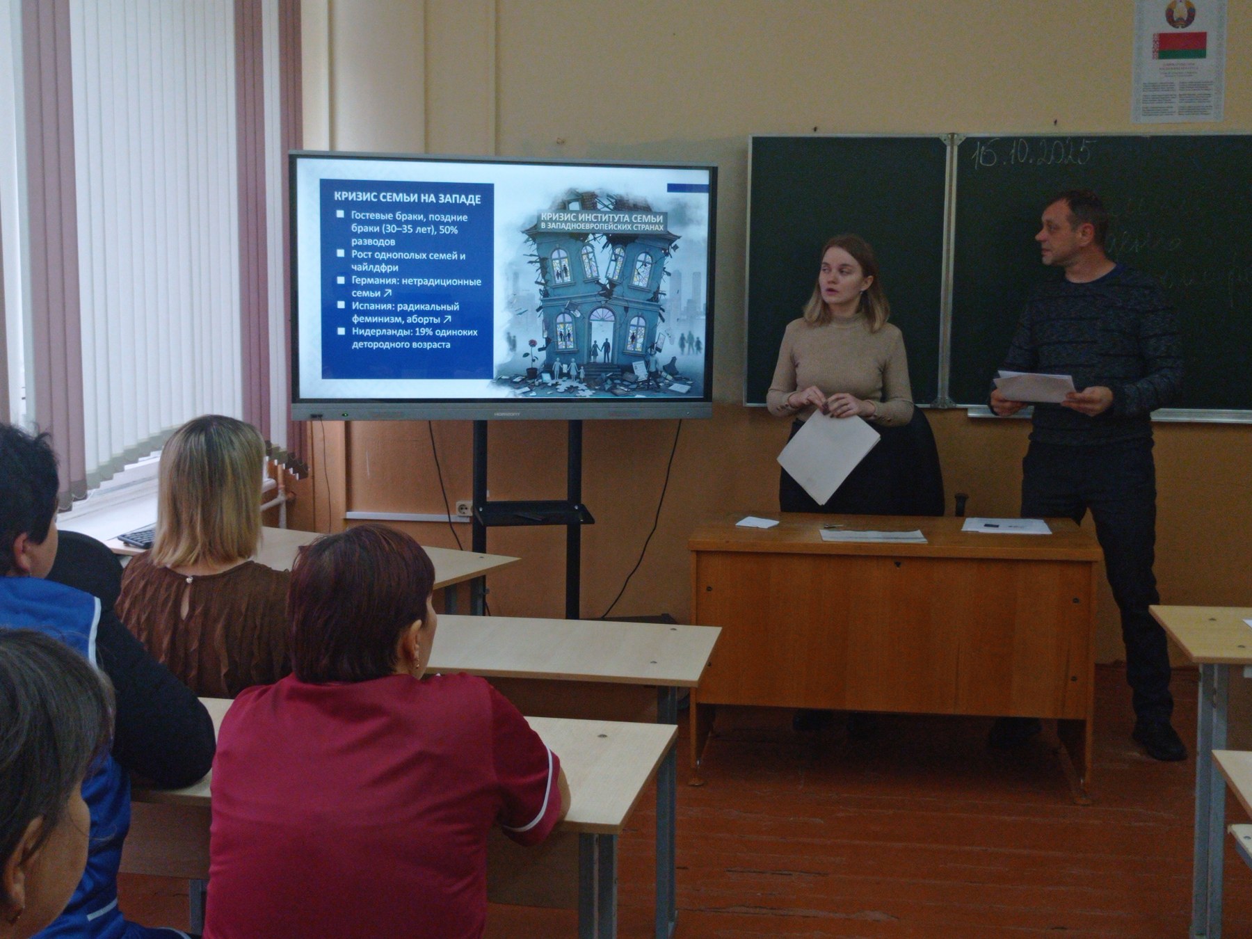 16.10.2025 состоялся Единый день информирования «Роль семейных ценностей в современном обществе». Крепкая и здоровая семья- залог успешного будущего суверенной Республики Беларусь. Укреплять институт семьи, поддерживать семейные ценности и традиции- значит инвестировать в будущее.