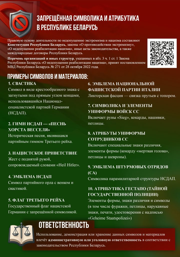 Запрещённая символика и атрибутика в РБ 18 Фев,2026 adminLeave a comment ПОСТАНОВЛЕНИЕ МИНИСТЕРСТВА ВНУТРЕННИХ ДЕЛ РЕСПУБЛИКИ БЕЛАРУСЬ 28 октября 2022 г. № 271